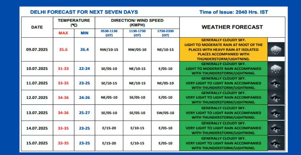 Looking ahead to Thursday, July 10, the weather in Delhi is anticipated to remain pleasant. The India Meteorological Department (IMD) forecasts a generally overcast sky with light to moderate rain expected across different parts of the city. Isolated thunderstorms and lightning are also likely, particularly in the late afternoon and evening hours. Following Wednesday's rainfall, the maximum temperature is projected to hover around 32°C, with humidity levels reaching 90%, which may lead to discomfort for some residents.