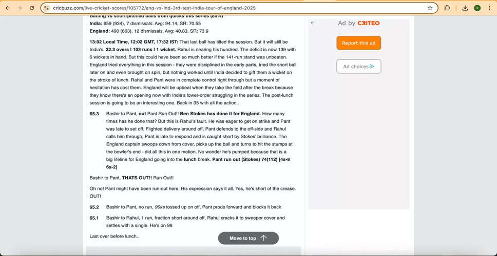 "Bashir to Pant, out Pant Run Out!! Ben Stokes has done it for England. How many times has he done that? But this is Rahul's fault. He was eager to get on strike and Pant was late to set off. Flighted delivery around off, Pant defends to the off-side and Rahul calls him through, Pant is late to respond and is caught short by Stokes' brilliance. The England captain swoops down from cover, picks up the ball and turns to hit the stumps at the bowler's end – did all this in one motion. No wonder he's pumped because that is a big lifeline for England going into the lunch break." This commentary was provided during the third ball of the 65th over.